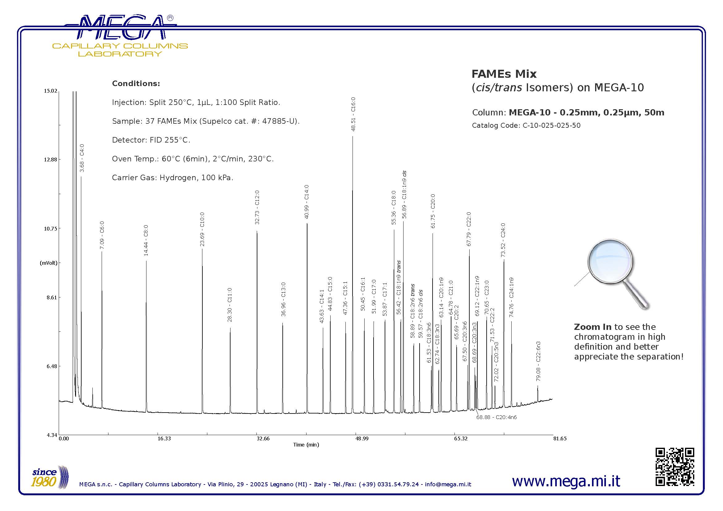 1,以50米長度的MEGA-10石英毛細管柱分離37種脂肪酸甲酯,效果可以媲美其它品牌50米長度的產(chǎn)品,不僅縮短了分離時 間,而且大大降低了產(chǎn)品成本。