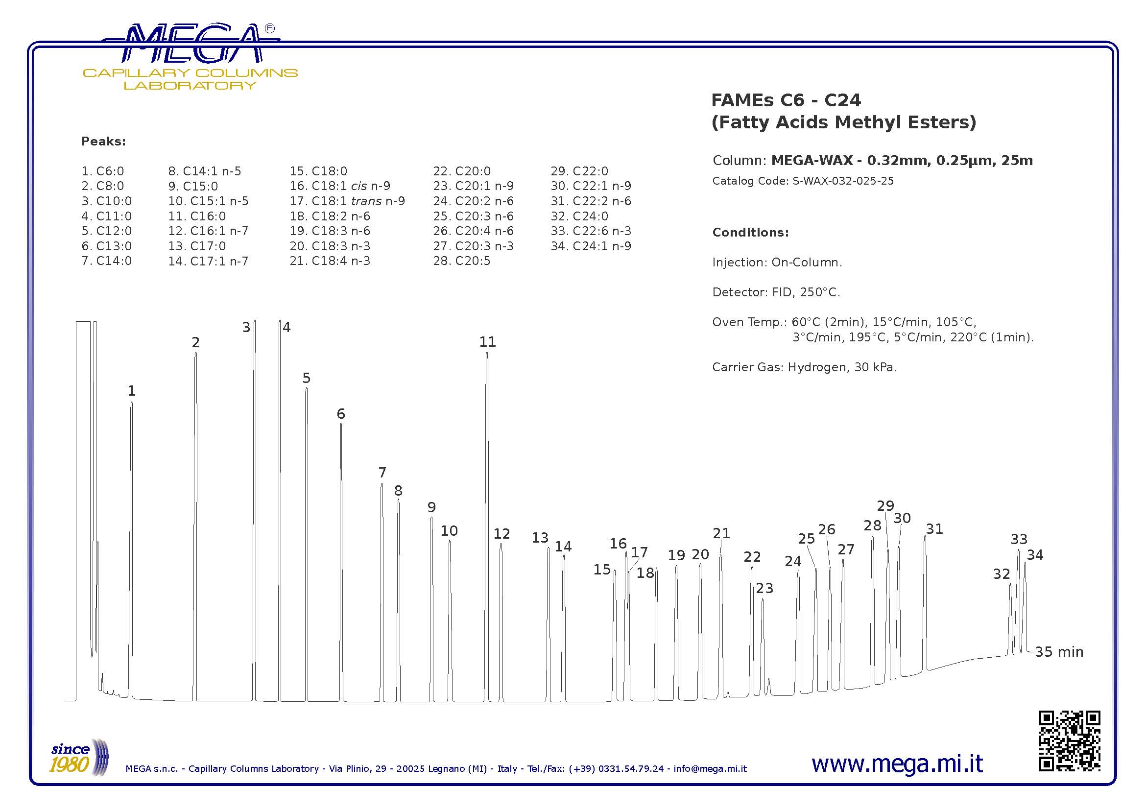 我們向您推薦使用MEGA-WAX石英毛細(xì)管氣相色譜柱,完全分離34種C6~C24碳鏈的飽和/不飽和脂肪酸,包括:C18:1 cis n-9、C18:1 trans n-9組份,色譜柱的長(zhǎng)度為:25m x 0.32mm 0.25um df,保留時(shí)間大約35分鐘。與MEGA-50柱相比,不僅縮短分析時(shí)間,而且降低產(chǎn)品分析成本。