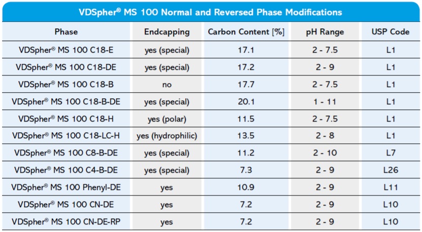 疏水性LC-MS/MS色譜柱通過(guò)獨(dú)特的反相液相色譜填料表面處理和端基封尾技術(shù),99%封閉活性硅醇基,非常好的解決了堿性化合物峰形拖尾的問(wèn)題,消除了記憶效應(yīng)。親水性LC-MS/MS色譜柱包括VDSpher MS 100 C18-DE、VDSpher MS 100 C18-B和VDSpher MS 100 C18-B-DE.