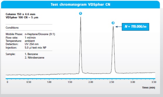 2、CN液相色譜填料性能-高柱效:119,000/m,當今常規(guī)正相液相色譜柱最高柱效的代表。