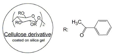 纖維素型是使用最廣泛的手性柱之一,纖維素型手性色譜柱的分離作用包括相互吸引的作用及形成包埋復(fù)合物。它們屬于Wainer分類中的第2種類型。市售的手性色譜柱為微晶三醋酸基、三安息香酸基、三苯基氨基酸鹽纖維素固定相。很多化合物可通過此類型的色譜柱得到分離。這種類型的手性色譜柱種類也很齊全。流動相使用低極性溶劑,典型的流動相為異丙醇-正己烷混合物。這類柱子根據(jù)制作工藝,分為涂敷與鍵合兩大類。但特別要注意由于氯可以使涂敷纖維素從硅膠上脫落,因此要確保涂敷類柱子流動相中無含氯溶劑。