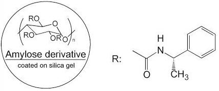 纖維素型是使用最廣泛的手性柱之一,纖維素型手性色譜柱的分離作用包括相互吸引的作用及形成包埋復(fù)合物。它們屬于Wainer分類中的第2種類型。市售的手性色譜柱為微晶三醋酸基、三安息香酸基、三苯基氨基酸鹽纖維素固定相。很多化合物可通過此類型的色譜柱得到分離。這種類型的手性色譜柱種類也很齊全。流動相使用低極性溶劑,典型的流動相為異丙醇-正己烷混合物。這類柱子根據(jù)制作工藝,分為涂敷與鍵合兩大類。但特別要注意由于氯可以使涂敷纖維素從硅膠上脫落,因此要確保涂敷類柱子流動相中無含氯溶劑。