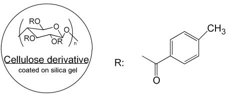 纖維素型是使用最廣泛的手性柱之一,纖維素型手性色譜柱的分離作用包括相互吸引的作用及形成包埋復(fù)合物。它們屬于Wainer分類(lèi)中的第2種類(lèi)型。市售的手性色譜柱為微晶三醋酸基、三安息香酸基、三苯基氨基酸鹽纖維素固定相。很多化合物可通過(guò)此類(lèi)型的色譜柱得到分離。這種類(lèi)型的手性色譜柱種類(lèi)也很齊全。流動(dòng)相使用低極性溶劑,典型的流動(dòng)相為異丙醇-正己烷混合物。這類(lèi)柱子根據(jù)制作工藝,分為涂敷與鍵合兩大類(lèi)。但特別要注意由于氯可以使涂敷纖維素從硅膠上脫落,因此要確保涂敷類(lèi)柱子流動(dòng)相中無(wú)含氯溶劑。