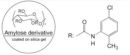 纖維素型是使用最廣泛的手性柱之一,纖維素型手性色譜柱的分離作用包括相互吸引的作用及形成包埋復(fù)合物。它們屬于Wainer分類(lèi)中的第2種類(lèi)型。市售的手性色譜柱為微晶三醋酸基、三安息香酸基、三苯基氨基酸鹽纖維素固定相。很多化合物可通過(guò)此類(lèi)型的色譜柱得到分離。這種類(lèi)型的手性色譜柱種類(lèi)也很齊全。流動(dòng)相使用低極性溶劑,典型的流動(dòng)相為異丙醇-正己烷混合物。這類(lèi)柱子根據(jù)制作工藝,分為涂敷與鍵合兩大類(lèi)。但特別要注意由于氯可以使涂敷纖維素從硅膠上脫落,因此要確保涂敷類(lèi)柱子流動(dòng)相中無(wú)含氯溶劑。