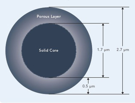 核殼顆粒是由著名色譜科學(xué)家 Jack Kirkland 教授于2006年研制成功的?!昂藲ば汀碧盍献畛跏菫榱耸筓HPLC色譜柱比常規(guī)2μm填料UHPLC色譜柱更堅(jiān)固可靠。Fused-Core(核殼或熔融) 技術(shù)就是將多孔硅殼熔融到實(shí)心的硅核上面而制備出的。這些多孔的“光環(huán)”狀顆粒具有極小的粒徑分布和擴(kuò)散路徑,可以同時(shí)減小軸向和縱向擴(kuò)散,減小峰寬,提高柱效。核殼技術(shù)被證明非常有效,因此衍生了多種不同的品牌和固定相類別,成了HPLC和UHPLC中有力的色譜工具。